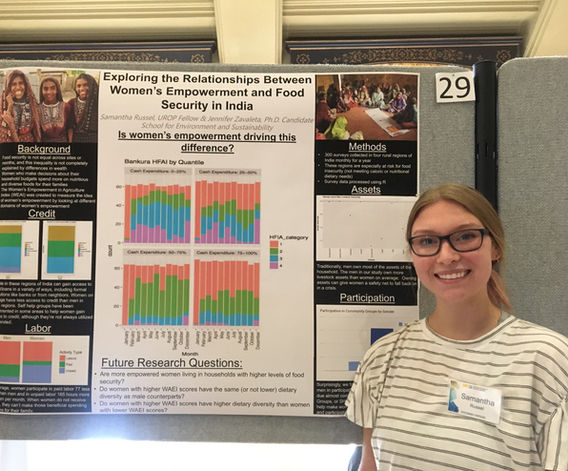 Samantha Russel is an Information major with a focus on Information Analysis and a minor in Applied Statistics. Sam worked with Jennifer my freshman and sophomore years through the Undergraduate Research Opportunity Program and the Women and Gender Summer Fellowship Program. During our time together, she studied the livelihood and climate adaptation strategies of farmers in rural India, utilizing NVivo, OpenRefine, and R along the way. Her main focus was data cleaning and model development in R. She has presented three posters at UROP symposiums and has given oral presentations at the Sustainable Development Conference and the Michigan University-Wide Sustainability and Environment Conference.